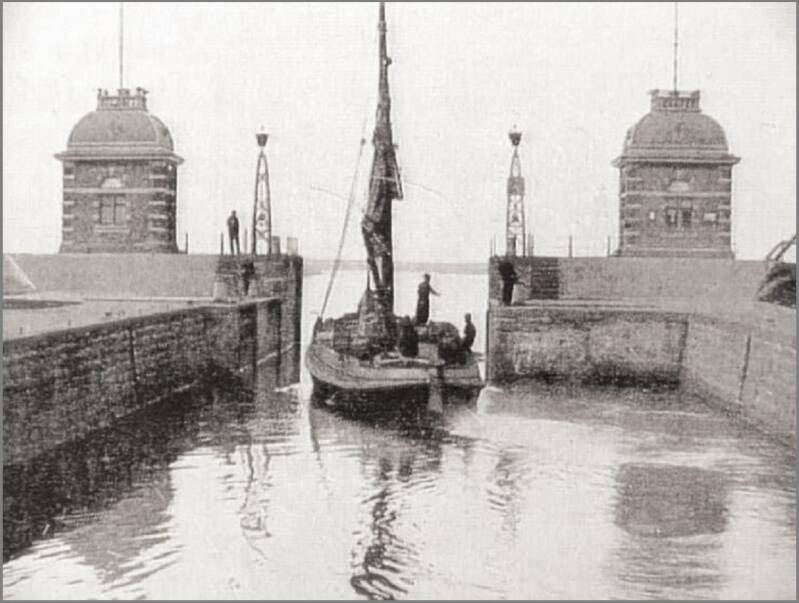 Op deze foto gaat een schip met turf de sluis binnen, links voor de sluis ligt ook een turfschip. Op de plaats waar dit schip ligt, was heel vroeger de remming met aan het einde een stoel van palen, waaraan bij stormweer de trossen van de tramboten werden vastgezet om de boten door de trambrug te kunnen sturen.
