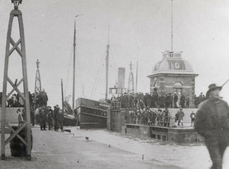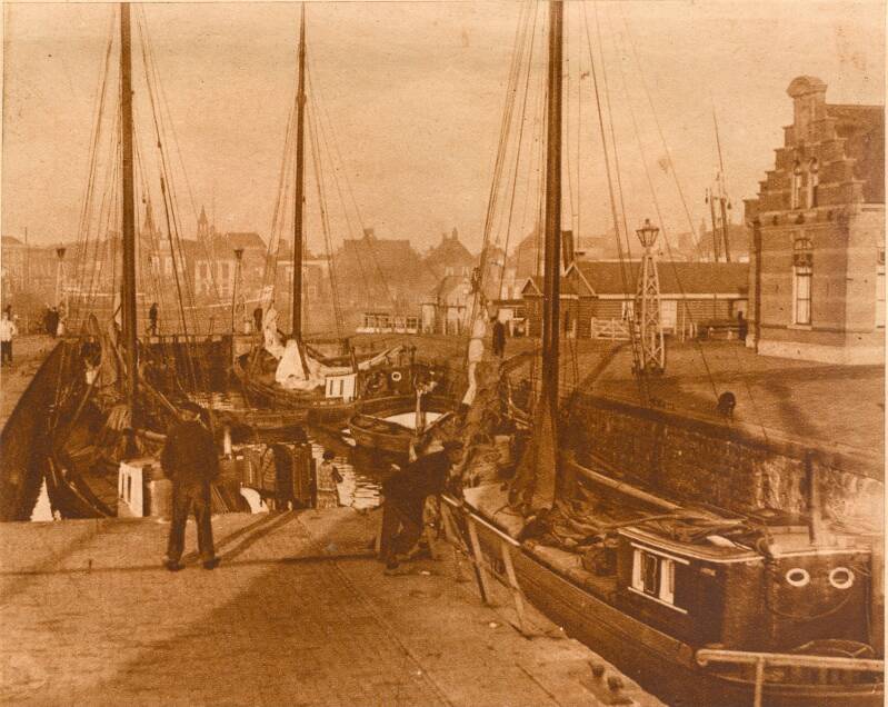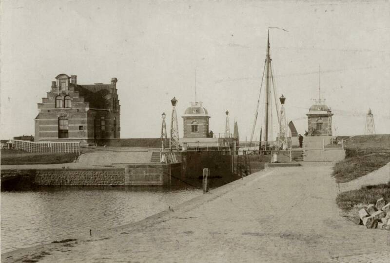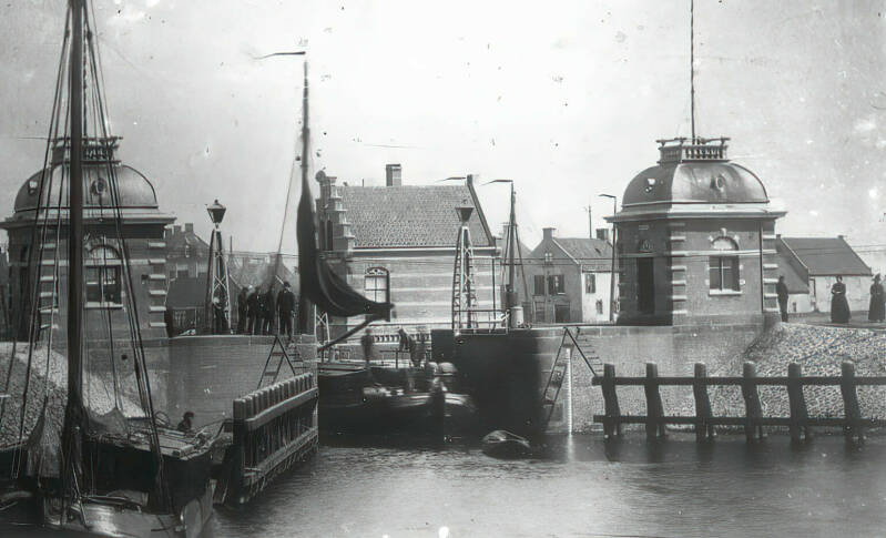 De remming rechts, werd doorgetrokken tot de plaats waar toen een toilet kwam, voornamelijk bestemd voor de vissers. Voor zover te zien valt, stond er nog maar één sluiswachterswoning. Daarachter liggen een drietal schepen. Tussen deze woning en het sluishokje, zien we de latere visrokerij van Johannes Sterk. Rechts zien we een man en twee vrouwen.