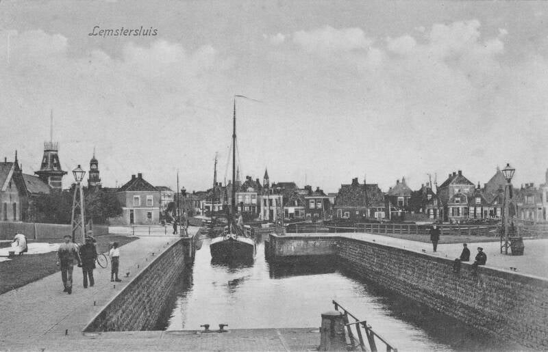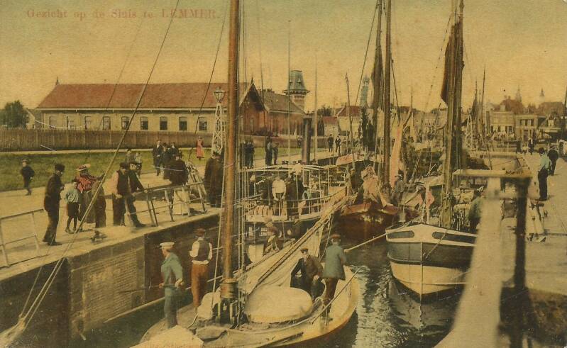 De Lemstersluis omstreeks 1907; Deze foto van de Lemstersluis werd op 10 januari 1908 vanuit Lemmer verzonden naar Groningen. De nieuwe sluis werd in 1888 geopend, aan de sluis is sindsdien heel weinig veranderd, alleen het torentje van het tramstation is verdwenen, wel is de bebouwing rondom de sluis met name in de naoorlogse jaren drastisch veranderd. Opvallend is de drukte in de sluis. De Lemster Sluis tijdens het schutten van schepen. Een herkenbare situatie, want 's zomers ziet het er tegenwoordig nog precies zo uit. Helemaal vooraan ligt een schip dat aan de wedstrijden deel gaat nemen; het is al startklaar gemaakt.
