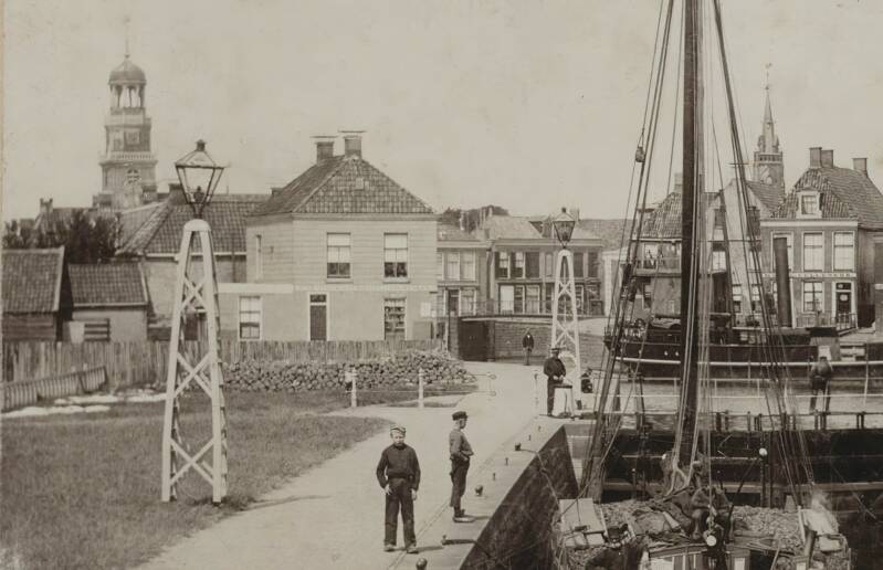Aan de kleding van de vrouwen - een jak met een bonte schort en een kapje op - kun je wel zien dat het hier om een zeer oude opname gaat. Waar nu het Leeg is, lijken zeer hoge huizen te staan. Boven op de sluis staan vier mannen; aan hun kleding zou je bijna zeggen, dat dat wel Lemster notabelen geweest moeten zijn.