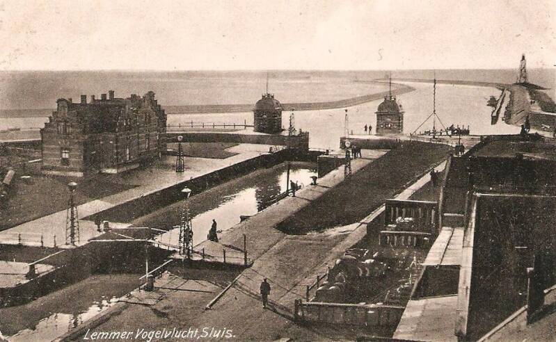 Op de foto ziet alles er keurig netjes uit. Geen wonder want op dat tijdstip (rond 1912) was er nog maar een kwart verstreken van de ruime eeuw dat de aanleg van de sluis en en havenwerken nu geleden is. Vuurtoren, remmingwerken, sluishokjes, sluiswoningen, Oost en Westdam, met daarachter het zeewater en dat alles onder een lucht met een fraaie wolkenpartij. Wat was alles toen nog een stuk rustiger!