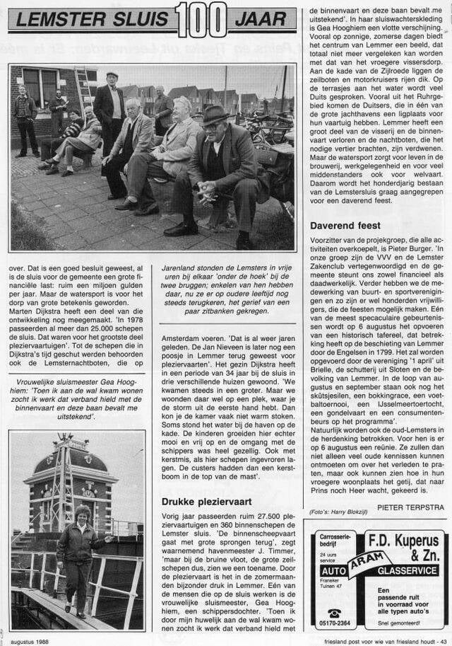 Bovenstaande zes foto's. -Door de schoonmaakbeurt van de Lemstersluis, kunnen de kleinere schepen niet meer door Lemmer varen. De sluis was namelijk niet alleen dringend aan het schoonmaken van de deuren toe, ook de drempels en de muren moeten terdege worden nagezien. Daarom werd de hele kolk leeg- gepompt, hetgeen natuurlijk de scheep- vaart onmogelijk maakt. Gehoopt wordt dat de herstelwerkzaamheden op 10 september hun beslag hebben gekregen.