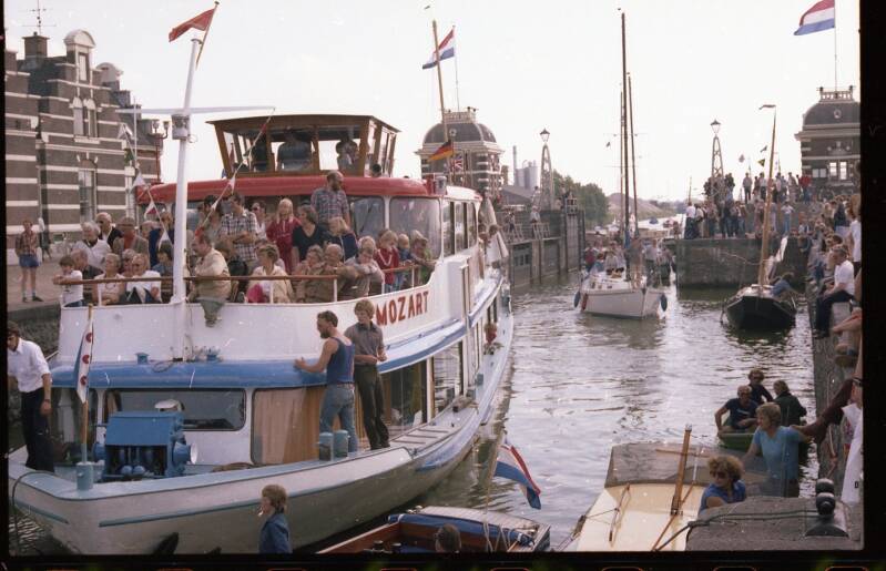 De Lemster kanonniers, zijn dan al tussen het publiek gevlucht. In een enorme rookwolk en onder oorverdovend geknal varen de Engelsen in werkelijkheid leden van de vereniging ’1 April’ uit Brielle met hun Prince Admirael, de sluis in. Hoewel je zou verwachten dat al deze herrie de aandacht van een ieder opeist, stoort de tweekoppige bemanning van het Friese statenjacht Friso, dat afgemeerd ligt aan de kade van de Binnenhaven, zich niet aan de drukte. Haar aanwezigheid wordt pas later op de middag verlangd en vandaar dat beide heren zich in het vooronder van de Friso te goed doen aan een Chinese afhaalmaaltijd en een pijpje pils.