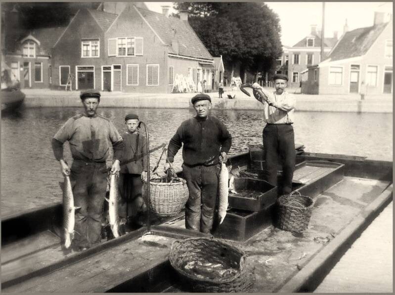 De Lemmer, de Binnenhaven omstreeks 1915. Vishandelaar Sterk en zijn vrouw poseren voor de fotograaf. Op de achtergrond het grote pand ‘Oersjoch’ waar Poppe de Rook woonde. Achter Sterk 'It Leeg' met de rokerijen van De Rook en De Jager en de nettenbaan van Pen. Op de dijk de stokken van de vissers om het staand want op te drogen.