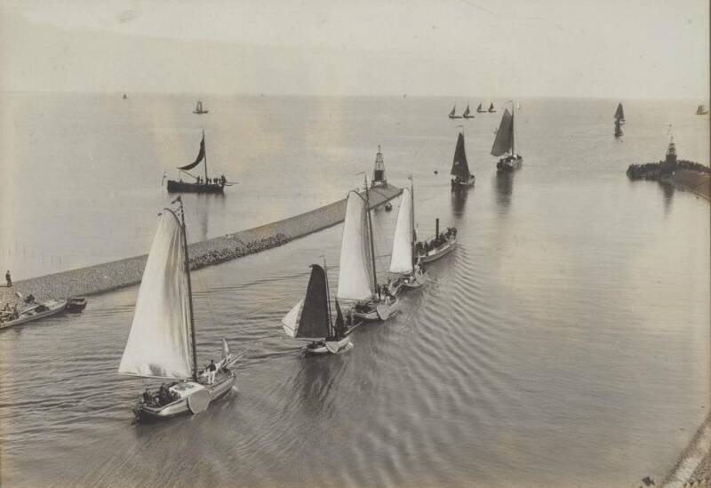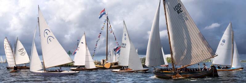 Zeilwedstrijd tijdens de Sneekweek bij het verdronken eiland de Roekoepôlle met rechts het Fries jacht de Mercurius en midden achter het Fries statenjacht, de boeier Friso. Heden en verleden zeilt hier dus langs elkaar.