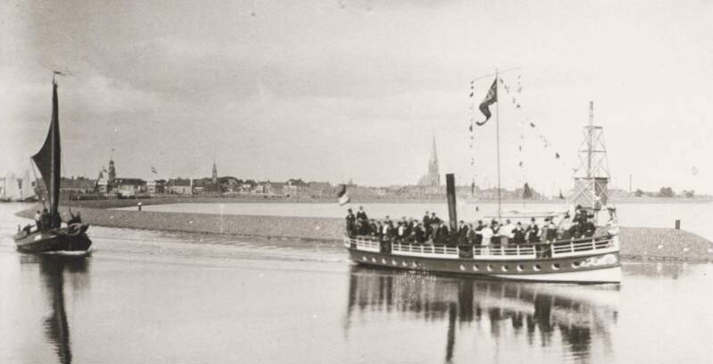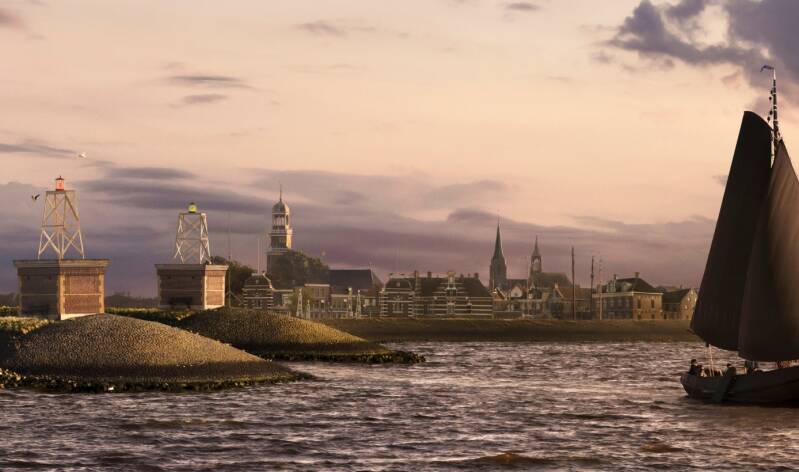 De ingang van de Vluchthaven van De Lemmer is hier voorzien van forse havenhoofden die te maken hebben met eb en vloed. In werkelijkheid waren de strekdammen met lichtopstanden veel bescheidener. Het verschil tussen eb en vloed bedroeg bij De Lemmer slechts 0,24 meter ten tijde van de open Zuiderzee. (Zie foto hieronder)