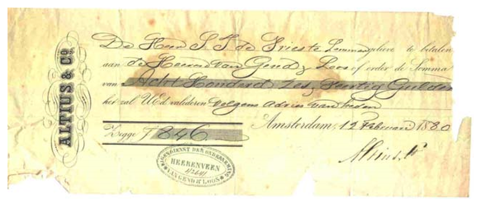 Op een wissel van de Harlinger houthandelaar B. van Loon & Zoon staat de oudste bekende houtaankoop van de firma De Vries. De wissel is tevens het oudste stuk in het archief