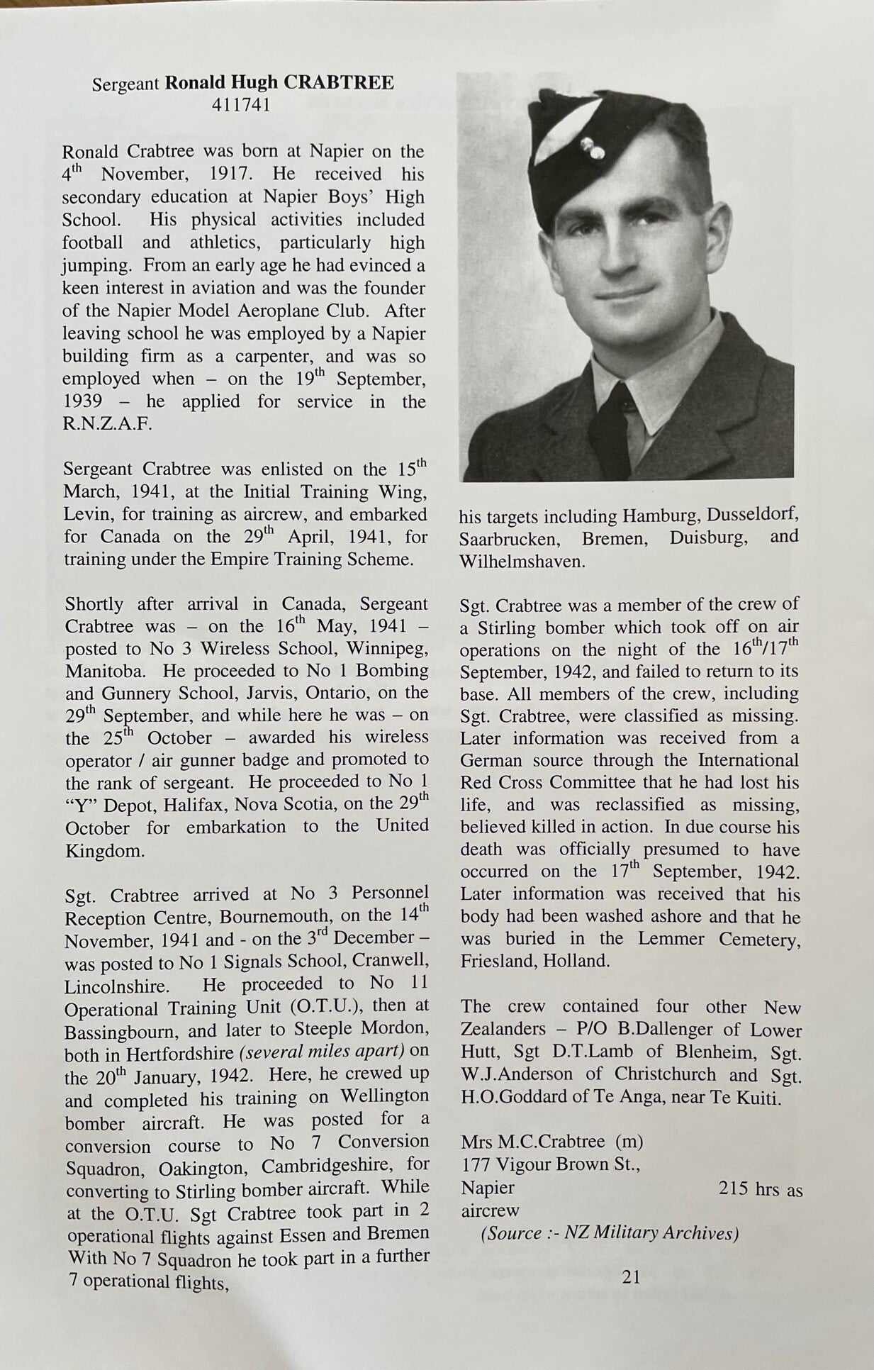- Sgt. Ronald Hugh Crabtree, RNZAF - Leeftijd 24 - 215 uur - 9e op.