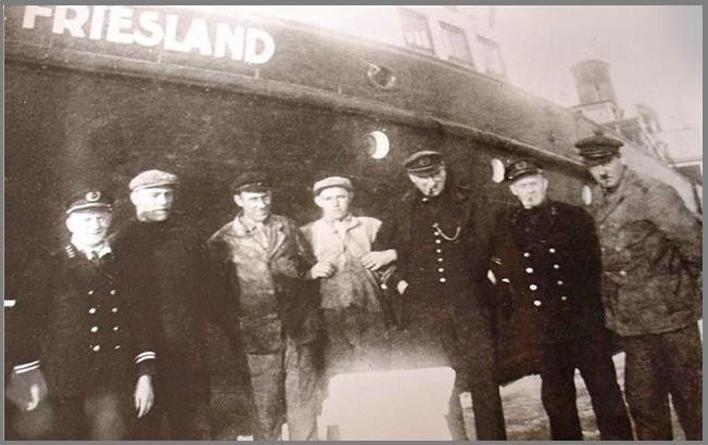 Bemanning van "De Friesland". 3e van rechts, Kapitein Bolhuis en uiterst rechts Piet Kamminga.