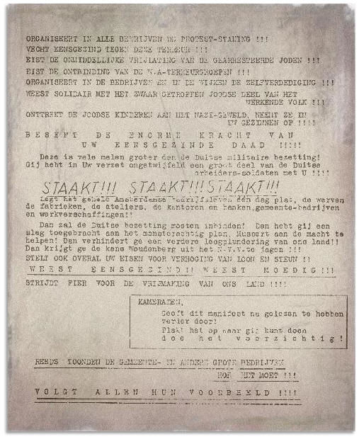 Legt het gehele Amsterdamse bedrijfsleven één dag plat, de werven, de fabrieken, de ateliers, de kantoren en banken, gemeentebedrijven en werkverschaffingen ! !