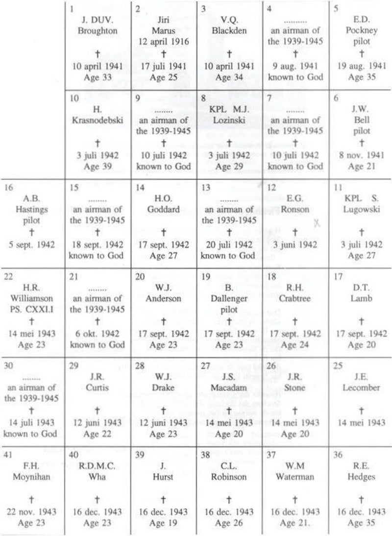 30 van deze personen kwamen uit Engeland, 2 uit Canada, 4 uit Australië, 5 uit Nieuw-Zeeland en 3 uit Polen. 7 'airman' uit Engeland en 1 uit Canada werden niet geïdentificeerd.
