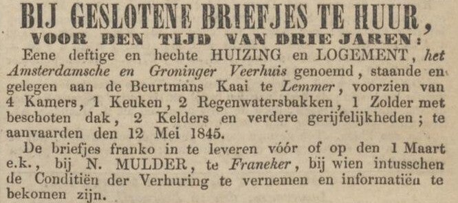 Als locatie werd toen niet de Veermans Kaaij maar de Beurtmans Kaaij genoemd. En op 4 januari 1845 werd het Amsterdamsche en Groninger Veerhuis opnieuw aangeboden, maar nu "uit de hand te huur". In 1846 lukte het Jan Groeneboer (hij woonde toen in Makkum) eindelijk het logement te verkopen en wel aan Hendrikus Tulleners en Jan Simons Knol voor 1400 gulden; Groeneboer had daarmee 2100 (!) gulden verloren.