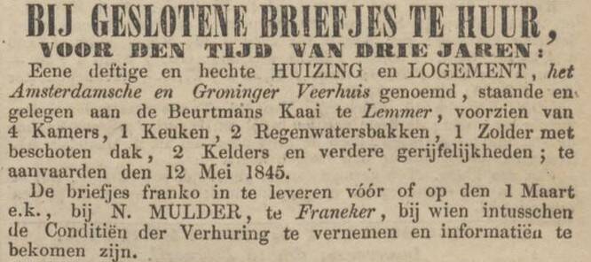 Op 13 januari 1837 werd de advertentie herhaald. Nadat Andries was overleden werd uit zijn boedel vastigheden verkocht. Het volgende stond onder "Verkoopingen te Lemmer" op 4 februari 1896 in de krant: