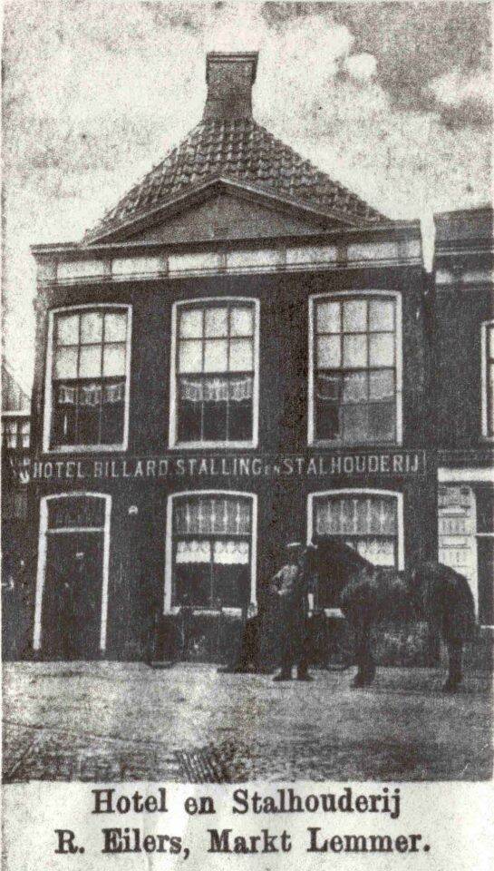 - Het van ouds bekende HOTEL "EILERS", waarin CAFE met vergunning, ruime VERGADERZAAL en afz. verhuurde BOVENWONING met vrijen opgang, op eersten stand, zeer gunstig gelegen aan de Markt en de Emmakade te Lemmer, kad. Groot 2.20 are. Geboden slechts 9784 gulden.