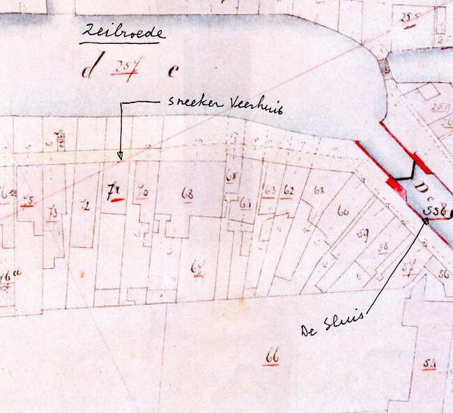 Afdruk uit omstreeks 1860, in ieder geval voor 1880: De brug links vormde de verbinding tussen de Kortestreek en de straat langs de sluis.