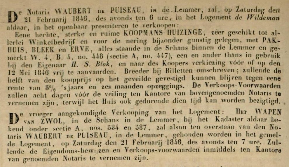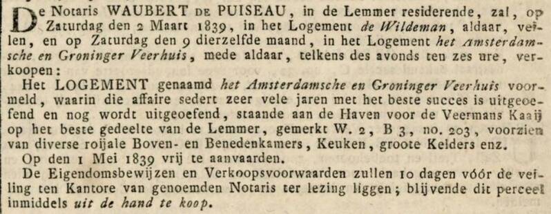 De Notaris WAUBERT de PUISEAU, in de Lemmer residerende, zal, op Zaturdag den 2 Maart 1839, in het Logement de Wildeman, aldaar, veilen, en op Zaturdag den 9 dierzelfde maand, in het Logement het Amsterdamsche en Groninger Veerhuis, mede aldaar, telkens des avonds ten zes ure, verkoopen: Het LOGEMENT genaamd het Amsterdamsche en Groninger Veerhuis voormeld, waarin die affaire sedert zeer vele jaren met het beste succes is uitgeoefend en nog wordt uitgeoefend, staande aan de Haven voor de Veermans Kaaij* op het beste gedeelte van de Lemmer, gemerkt W. 2, B 3, no. 203, voorzien van diverse roijale Boven- en Benedenkamers, Keuken, groote Kelders enz. Op den 1 Mei 1839 vrij te aanvaarden. De Eigendomsbewijzen en Verkoopsvoorwaarden zullen 10 dagen vóór de veiling ten Kantore van genoemden Notaris ter lezing liggen; blijvende dit perceel inmiddels uit de hand te koop.