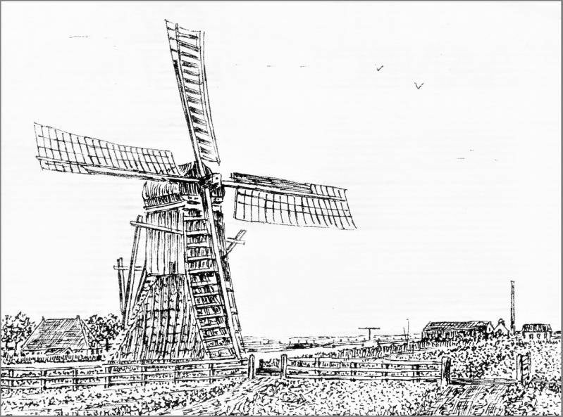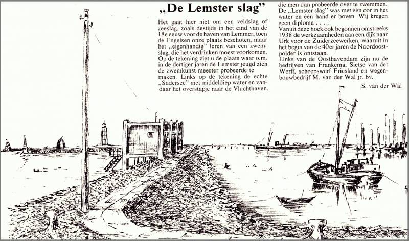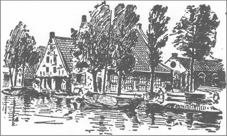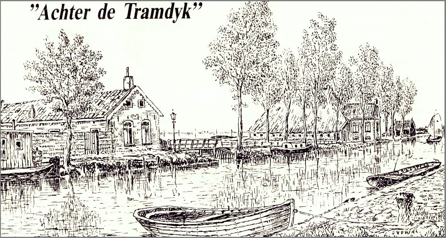 Achter de tramdijk: Dit beeld, zo rond de vijftiger jaren, is met uitzondering van het brugje, geheel verdwenen. Inmiddels zijn woningen gekomen met daarachter nog meer woningen, waartussen een straat is aangelegd, die nu met Villa Novalaan wordt aangeduid, welke naam is ontleend aan de boerderij rechts op de tekening. Het huis vooraan werd bewoond door twee gezinnen en achter de schutting was de moestuin van Siebe-Nieske, waaruit de groenten in Lemmer werden uitgevent. De voormalige zeilvereniging W.S.L. had onder de bomen z'n eerste aanlegsteiger, doch dat werd een flop, want teeraanslag van de gasfabriek deed de handel snel verhuizen.