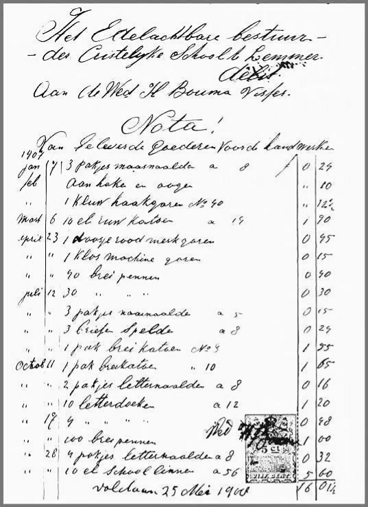 Voor f 60,- kun je in die tijd veel krijgen. Voor één el linnen betaalt men b.v. f 0,55 en een el katoen kost f 0,45. Dat het voornamelijk de nuttige handwerken betreft kan men wel opmaken uit het verdere materiaal dat zij aanschaft: breikatoen, ongebleekt katoen, stopnaalden en andere garens (voor sokken breien?).
