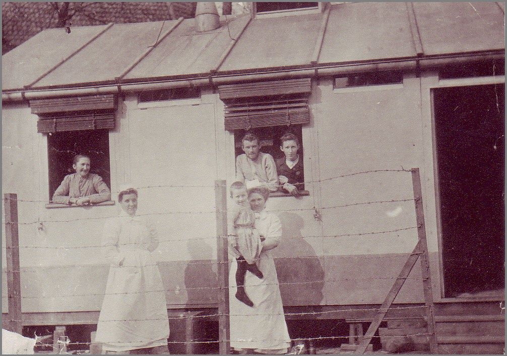 Het noodgebouw van de Tyfus Epidemie, in 1909. Op de arm is de verteller/schrijver Evert de Vries....Links: Uit het raam is de moeder van Evert, 2e uit het raam is Leeuwke Bootsma (Leeuwke was de broer van Roelie haar oma Roelofje Visser (Meuke Roel) Leeuwke was gehuwd met Meuke Johanna, zij kregen negen kinderen) en dan volgt Ferdinand de Vries de broer van Evert.