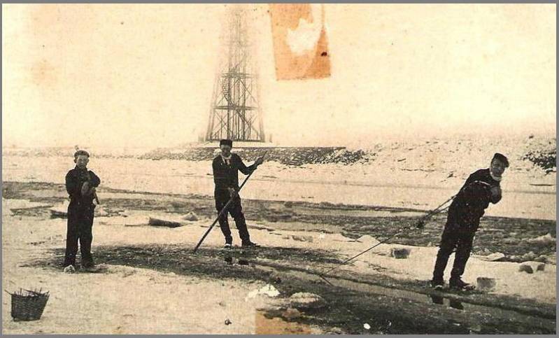 De vuurtoren is half in de mist verdwenen, het ijs is over de dam geschoven. Het lijkt wel een voorteken van wat er een aantal jaren zou gebeuren, namelijk de afbraak van de trouwe wachter. Hij zal ongeveer uit 1908 dateren. Op het ijs zijn twee man aan het paling schooien. Een derde kijkt toe. De man met het touw om de nek is Jan Balsma. Zijn vrouw heette Sietske. Uit hun huwelijk waren 8 kinderen geboren. Vijf jongens, Roelof, Jacob, Jouke, Jan en Harm en drie meisjes, Doekje, Jetske en Jantje, getrouwd met Bastiaan de Haan. Balsma zelf was altijd druk in de weer.