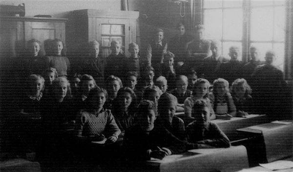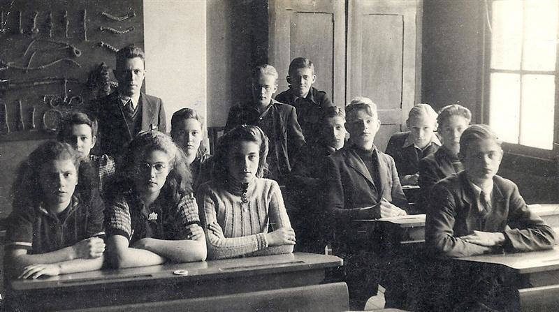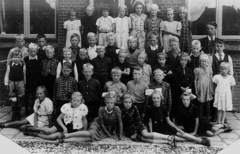 Schoolfoto 1945, 1e klas MULO. 1e rij: Sietse Oosterdijk, Minze Zeilstra, Jacob v.d. Wal, Rommie Aukema, Alie de Vries, Jeltje v.d. Veen, Jopie v.d. Berge, Tietje Visser, Jeppie Zeilstra, Aaltje Donker en Albertje Vlig.