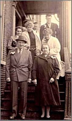 Foto van Hilda Visser, Hilda: "Het zijn mijn Pake en Beppe, Jacob Visser en Anna Hoekstra. De foto is gemaakt op de het oude Gemeentehuis in Lemmer, ter gelegenheid van de trouwerij van mijn oom en tante Catrien en Sicco Visser-Visser. Ook staat mijn tante Iepie en mijn oom Jan erop, linksboven mijn pake staat Piertje Kuipers. Ik zelf ben een dochter van Anne en Popkje Visser en heb een broer Jacob-Anne roepnaam Jappie.