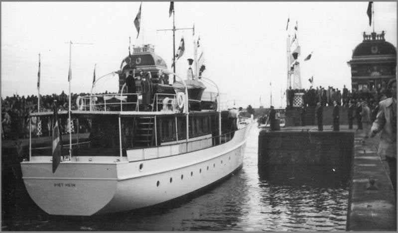 ‘Piet Hein’ met aan boord het koninklijk gezelschap verlaat de sluis.