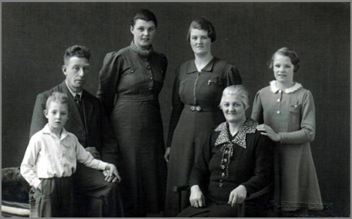 Van links naar rechts: Johannes Gerard [Joop ], 1932 Lemmer, vader Gerard , 1890 Bolsward/ 1959 Heerenveen, Elsje Johanna 1922 Purmerend /2010 Tilburg, Trijntje 1918 Purmerend, moeder Lutske van der Harst 1888 Siegertswoude/1971 Heerenveen en Luci 1927 Lemmer/1999 Enschede.