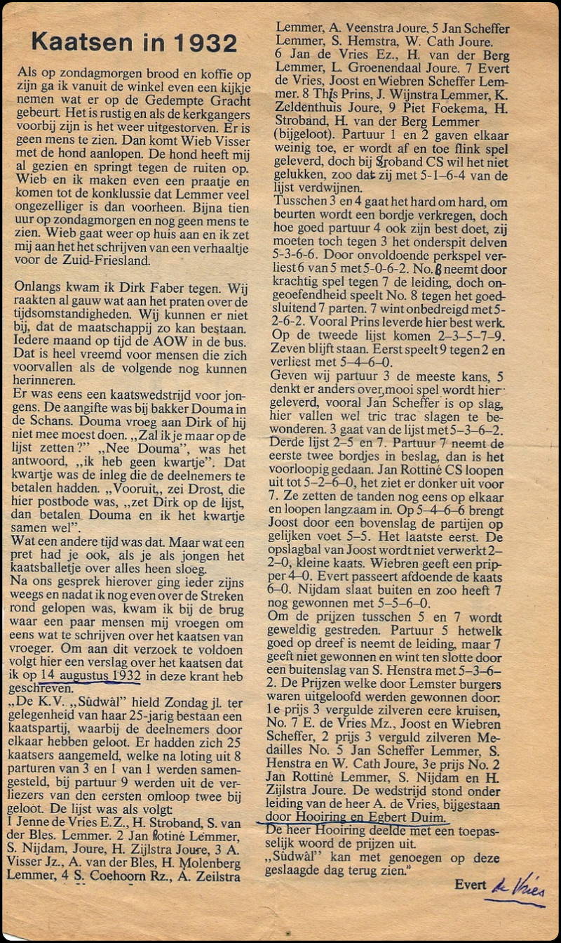 Mijn zuster Trienie werd als schoolmeisje op straat dan wel eens aangesproken met: "Jimme heit wier der ek by." Maar zij wist van niets. Wel weet ze zich te herinneren, dat er op de Markt voor de winkel wel eens rumoer ontstond als twee bekende Lemsters uit het Achterom weer eens beschonken waren.