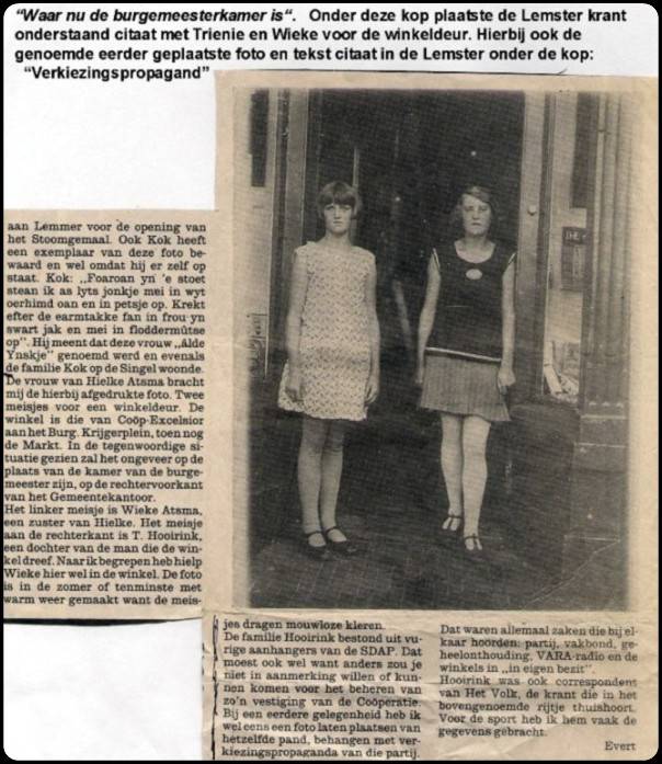 Onder deze kop plaatste de Lemster krant onderstaande foto met Wieke Atsma en Trienie Hooiring voor de winkeldeur van de Coöp-Excelsior op de Markt.