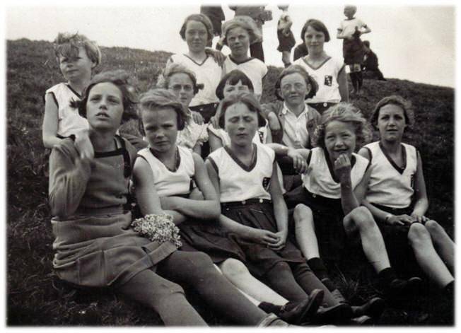 Wandeltocht N.A.S.B. Lemmer 1935. Nederlandse Arbeiders Sport Bond. Luci Hooiring, geboren in Lemmer, met haar sportgenootjes.