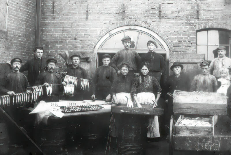 De mannen die achter bij het ronde raam staan...De linker man is Toon Woudhuizen en Marten Feenstra. De eerste drie mannen zijn aan het inpakken met mei-bokking, die klaar was voor bakbokking. Pieter heeft de hamer in de hand, waarmee hij de kistjes dichtmaakt. Rens en Kaat, staan de haring te speten, hier, met het oog op de foto, uit een vleet.