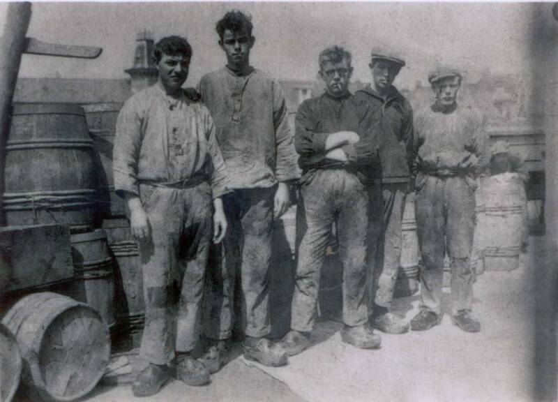 Arbeiders gefotografeerd midden tussen de vaten en ankers waarmee zij werkten, in 'De Hang' van 'De Rook'. Zij staan hier op de Emmakade en op de achtergrond zien we het torentje van het tramstation. De afgebeelde personen zijn: Anne Visser, Rikus Vlig, Willem Platte, Theunis Bootsma en Roelof Balsma.