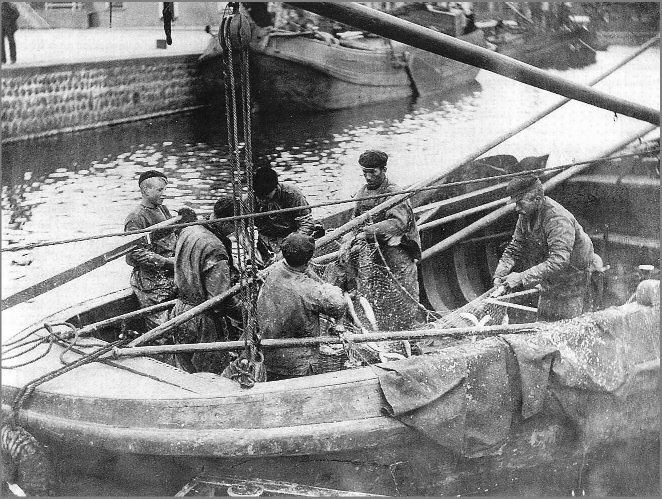 Vrouwen in de haven, bezig met de verwerking van sprot. Rechts op de achtergrond is de nettenbaan.