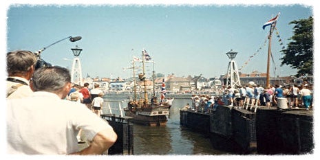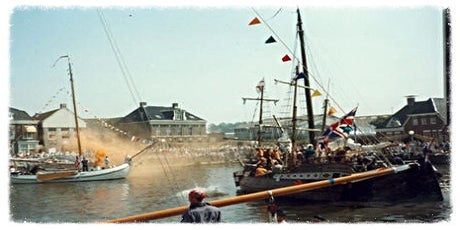De Lemster kanonniers, zijn dan al tussen het publiek gevlucht. In een enorme rookwolk en onder oorverdovend geknal varen de Engelsen in werkelijkheid leden van de vereniging ’1 April’ uit Brielle met hun Prince Admirael, de sluis in. Hoewel je zou verwachten dat al deze herrie de aandacht van een ieder opeist, stoort de tweekoppige bemanning van het Friese statenjacht Friso, dat afgemeerd ligt aan de kade van de Binnenhaven, zich niet aan de drukte. Haar aanwezigheid wordt pas later op de middag verlangd en vandaar dat beide heren zich in het vooronder van de Friso te goed doen aan een Chinese afhaalmaaltijd en een pijpje pils.