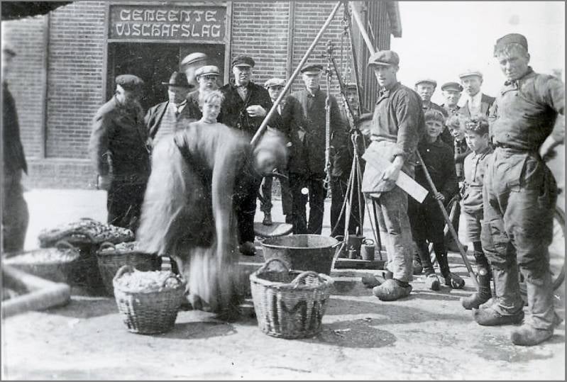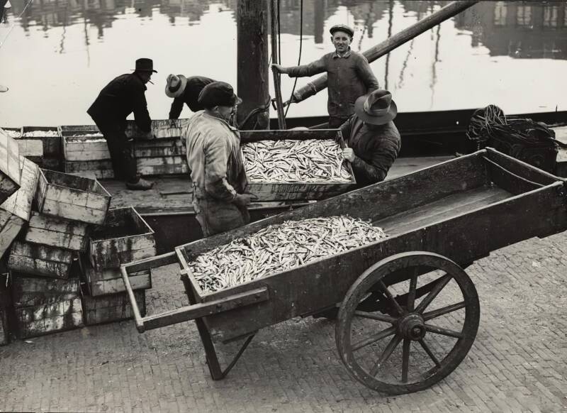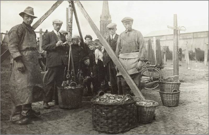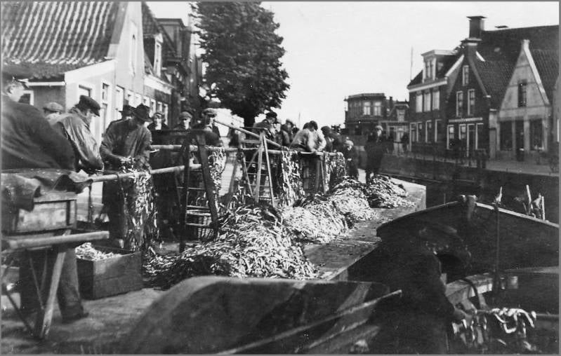 De ansjovisvisserij omstreeks 1930 op de Vluchthaven. De vis wordt aan de afslag gebracht, gewogen en daarna verkocht. Op de voorgrond de visserman M. Visser, P. Meijer, de directeur van de afslag, een belangstellende jongeman, Chr. de Vries, die bij de inval van de Duitsers in mei 1940 bij Achterveld in Utrecht sneuvelde en Jan Verbeek, hulp bij de afvoer van de gewogen vis.