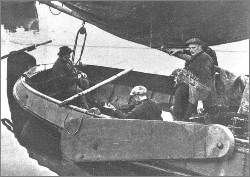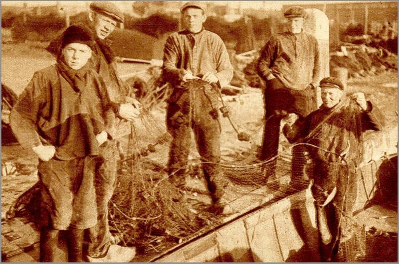 Haringvangst omstreeks 1930: De haring wordt uit de netten van de aak gehaald en overgeladen in een vlet. Vader Rienk Coehoorn en zijn zoons hadden een goede vangst gehad. Van links naar rechts; Willem de Blauw, Schelte Jan en Rienk Coehoorn en Anne Visser van de LE 20 zijn bezig met de vis, die uit de netten moet worden gehaald. Rienk Coehoorn, viste met de houten aak de LE 20 met aan boord zijn beide zonen Jan en Schelte. Rienk Coehoorn, speelde verder trombone bij "Excelsior" en had naast zijn twee zonen nog 5 dochters.