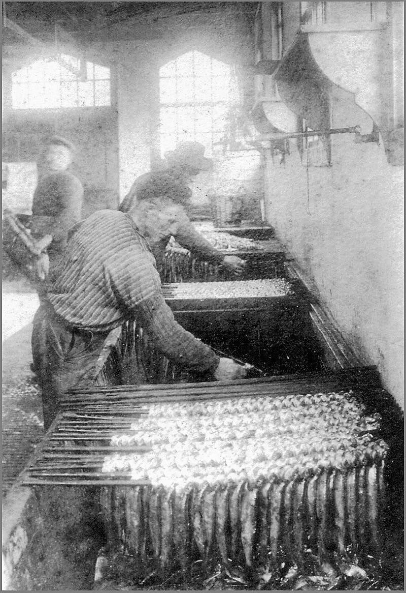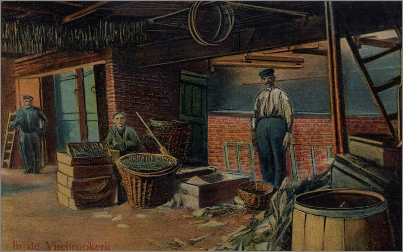 Op de voorgrond zijn hier twee mannen bezig om haring aan te speten, terwijl een derde man de volle speten verder brengt.