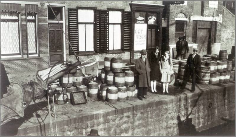 Op deze foto zien we de oude binnenhaven omstreeks 1930. De ansjovis wordt binnengehaald. Op de voorgrond worden de netten van de Lemmer 20 geleegd, het schip van Rienk Coehoorn. Links op de hoek staat het woonhuis van de familie de Rook. Achter dit pand lag een visrokerij. Achteraan op het havenhoofd zijn de palen voor het drogen van de netten zichtbaar. Iedere visser had hier zijn eigen baan. Dit terrein was verboden gebied voor kinderen: zij zouden tijdens het spelen de kostbare netten kunnen beschadigen.