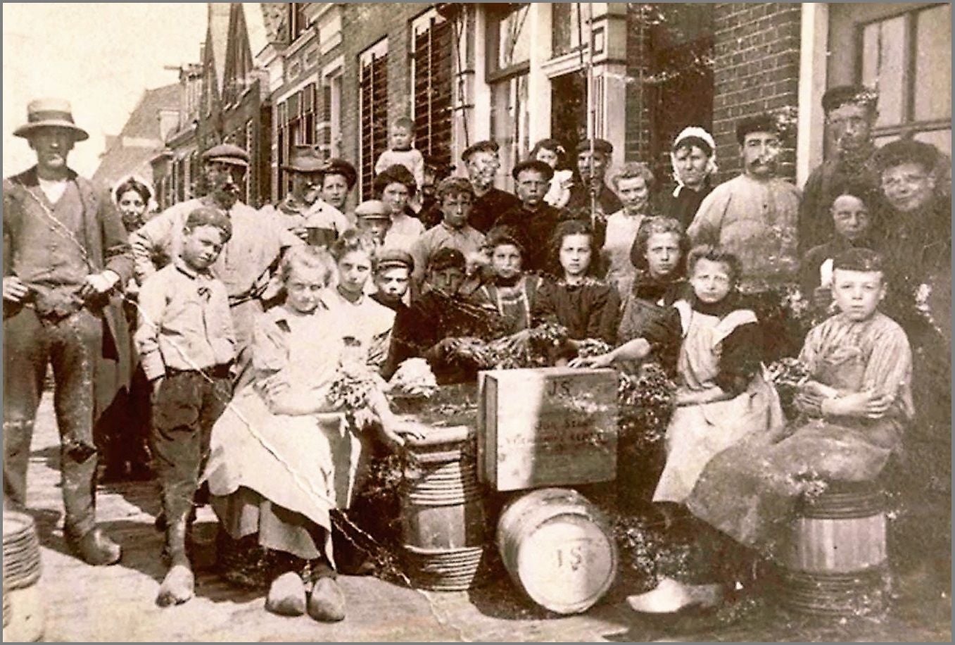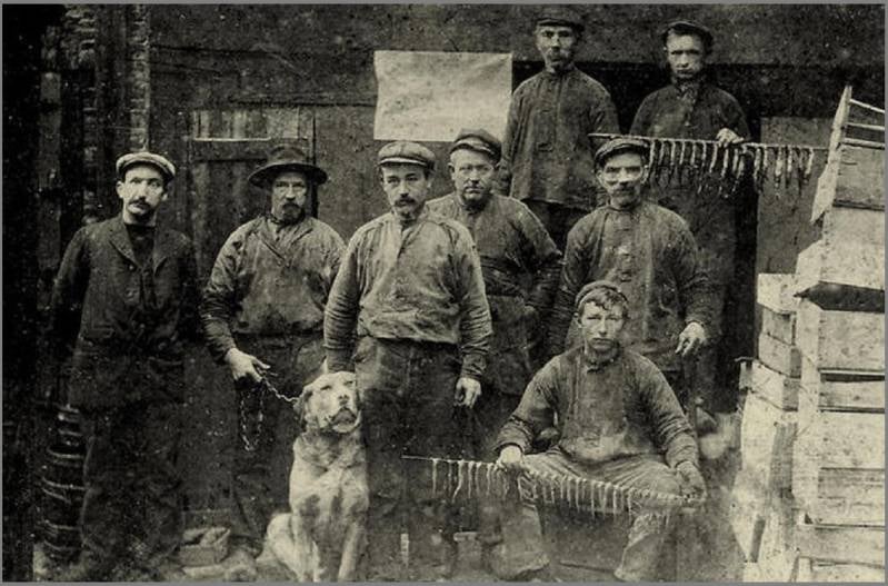 Op de tweede rij zien we de hangbaas Gerardus Sterk met Jolt de Hey, Klaas Sterk, Marten Rottiné en Petrus de Lange. Verder staat er nog de hond Hector op en zittend met een speet gerookte spiering is Ferdinand de Vries (broer van Evert de Vries)