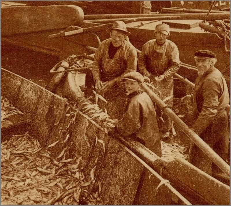 Lemsters in 1910, bezig met het ansjovis koppen aan de Emmakade. Een aantal bekende personen: geheel links met hoed Michiel Davidson, daarnaast met witte muts Foekje Visser, verder naar rechts ook met een witte muts Fetje van Rubert Bootsma uit 't Leeg, daarnaast Klaas Sterk.
