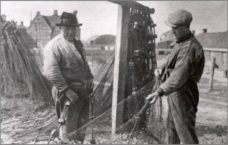 Een foto van de hang van Johannes Sterk. De beide bovenste mannen zijn A. de Lange en Antoon Huisman, met een speet met 20 echte Lemster bokkingen in de handen.
