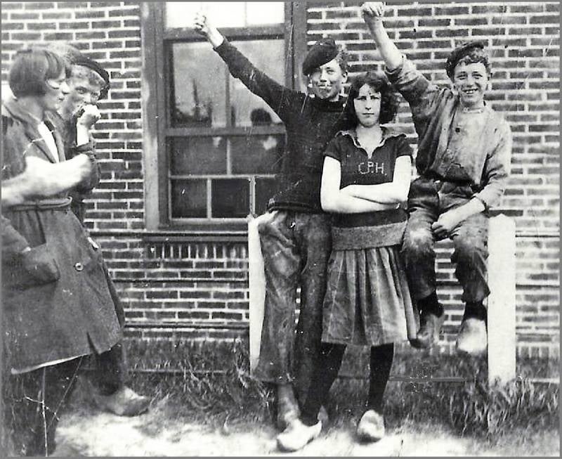 Een foto uit 1926/28, jongelui die al vroeg in de hangen werkten, de persoon links met de hand voor de mond is Sake Visser (Reade Sake)