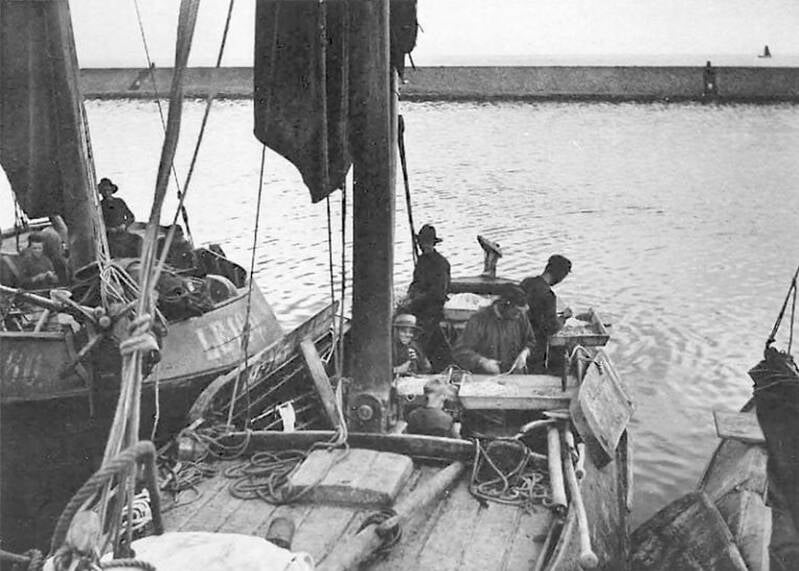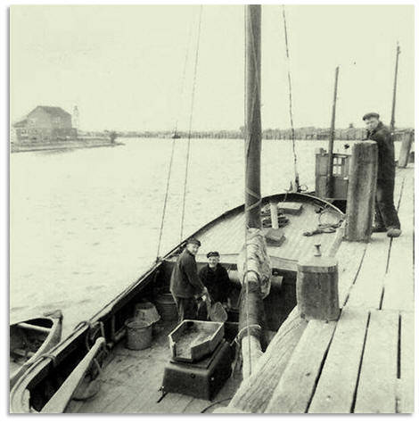 Een grote ansjovisvangst rond 1920. De netten worden pas in de Binnenhaven overgetrokken in het schip. Op de achtergrond is het tramgebouw te zien. Op de foto staan o.a. Bauke Kuipers en Iente Kingma.