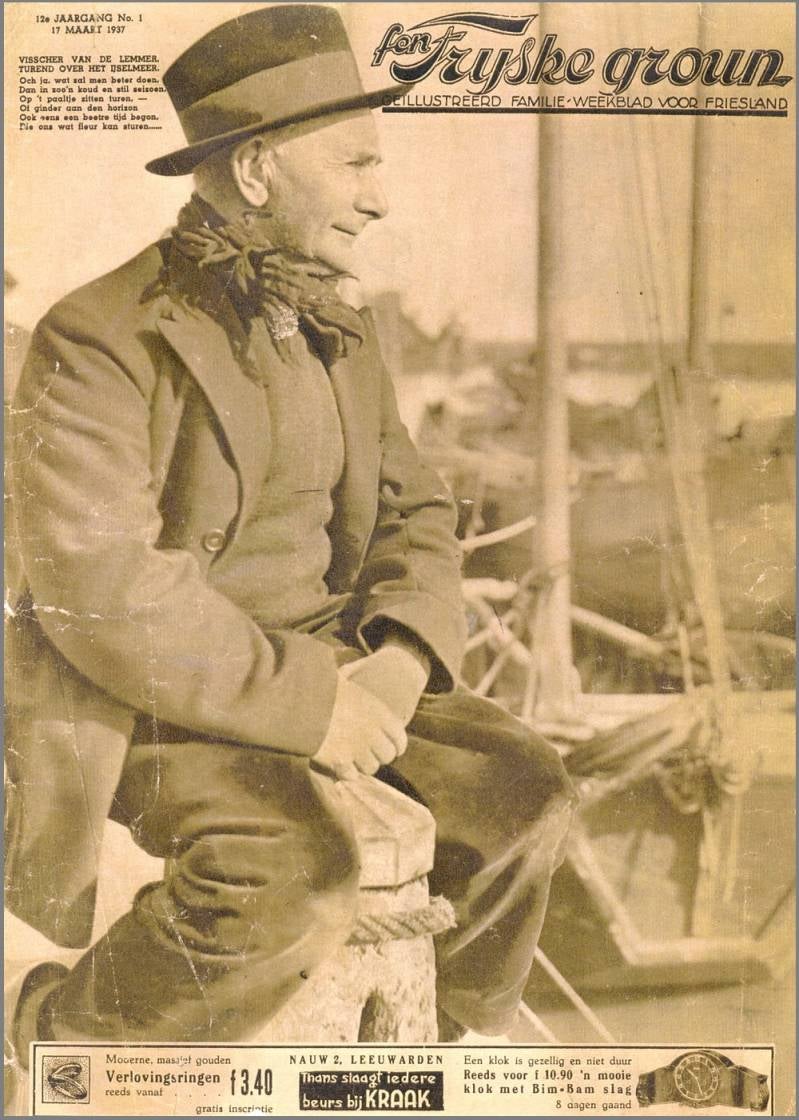 Lemmer een van de visschersplaatsen der Zuiderzee die door de totstandkoming van den Afsluitdijk bedreigd worden. De visschers hebben er hun eigen methode om de vangst versch te houden; de visch wordt in een speciaal net in het water bewaard. De LE 47 het nummer van Rauke Kuipers. (Zwarte Rauke) Beste hardzeiler.
