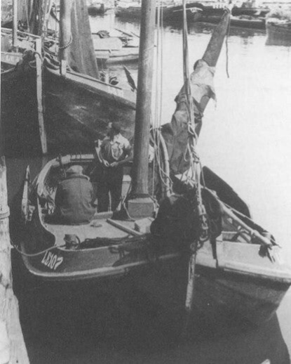 Het visaakje ‘Dolphijn’ met Hendrik Voordewind bij het roer rond 1950. (Foto: FSM)