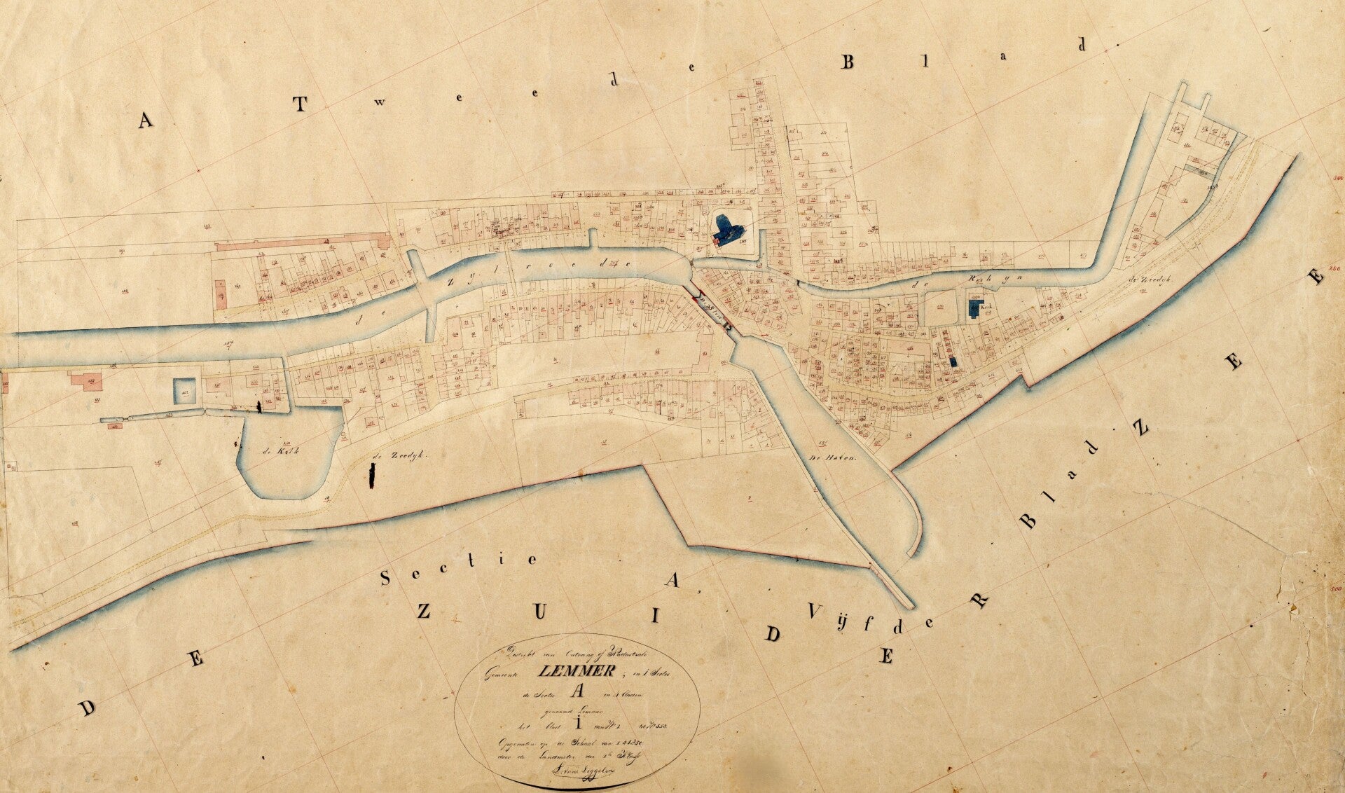 De Lemmer, rond 1800, voordat de ontwikkelingen met de Zuiderzeevisserij plaats vonden. Zwart gemarkeerd de N.H. kerk uit 1716, met de oorspronkelijke loop van de smalle Lemster Rien ten zuiden van de kerk en ten noorden van de oude zeesluis.