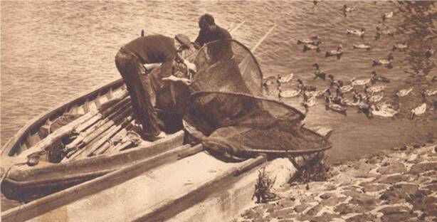 Aalvangst met fuiken in de haven van Hindeloopen, bij de lanceerplaats van de reddingboot. (Foto: Museum Hindeloopen)