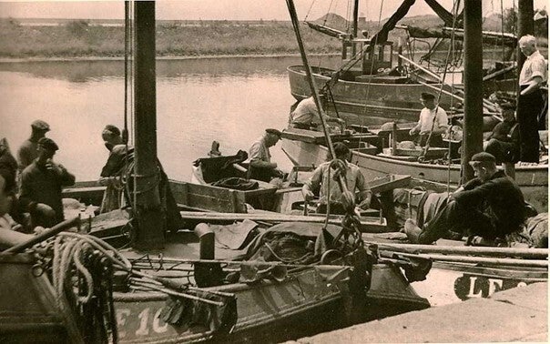 De Lemmer. In 1926 legde Jan Pen een Scheveningse bom aan de kade van de Vluchthaven, waar hij een taanderij in had gebouwd. De vissers konden gemakkelijk even langszij schieten om hun netten te (laten) tanen. Ze hoefden dankzij deze taanschuit niet langer de netten te vervoeren op een kar om bij een taanketel te komen. (Foto: collectie Dick van Dijk, Lemmer)