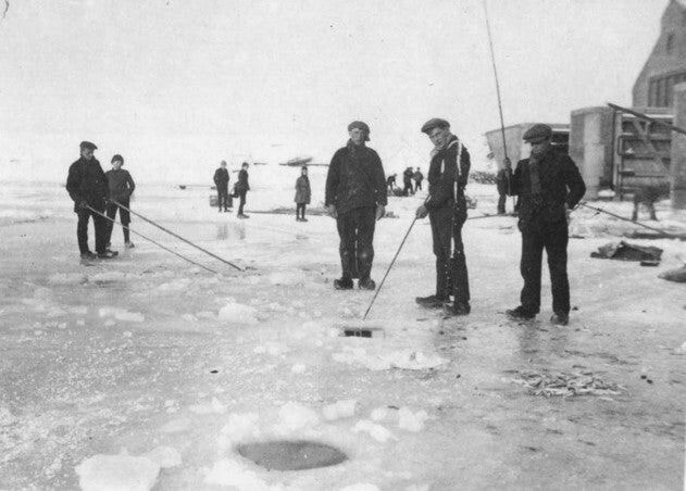 Lemmer, winter 1929. Spiering vissen met de hengel. (Foto: collectie Dick van Dijk, Lemmer)